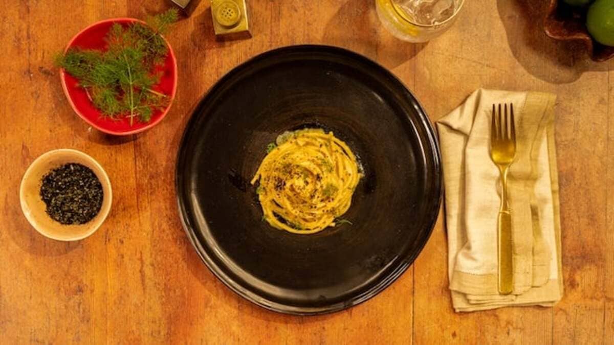 Spaghetti Al Bronzo à la Crème de Fenouil, Citron Vert, Orange et Poudre d’Algue Nori