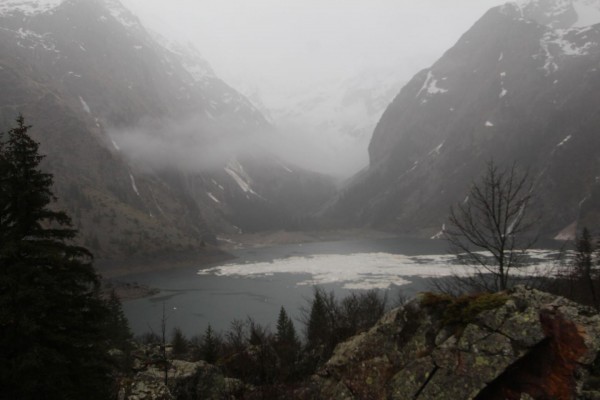 Après les fortes pluies du 1er mai, une grosse coulée de neige est descendue jusqu’au lac dont elle a recouvert près du tiers de la surface.