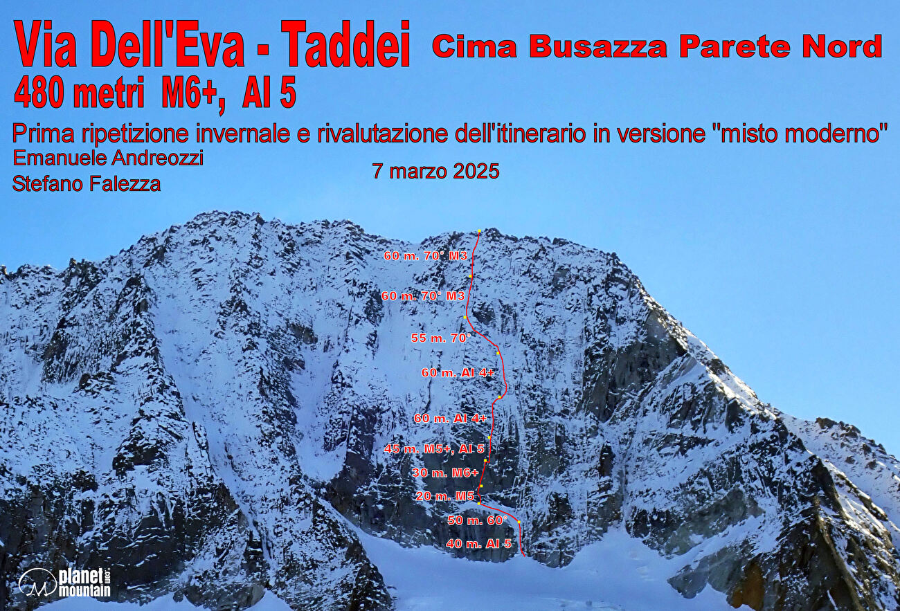 Le 7 mars 2025, Emanuele Andreozzi et Stefano Falezza ont fait ce qui est susceptible d’être la première ascension d’hiver de «Via Dell’Eva-Taddei» sur la face nord de Cima Busazza (Presanella, Italie). La montée estivale, est montée pour la première fois en 1969 et a été notée à l’origine V +, a été réinterprétée par Andreozzi et Falezza dans un style mixte moderne. Vous trouverez ci-dessous le récit d’Andreozzi sur la montée.