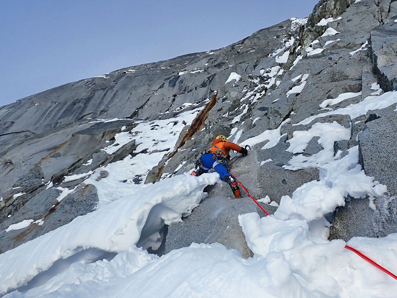 Le terrain suivant s’est avéré plus difficile, offrant une escalade soutenue et technique. Des crochets minces, de petits mais bons de bons et une excellente protection ont fait une avance passionnante. Seuls les derniers mètres sont devenus en train de voler le cœur, car la glace obstruait de plus en plus les fissures jusqu’à ce qu’ils soient complètement couverts, me laissant sans aucun moyen de placer un équipement. Malheureusement, la glace était composée de couches fragiles et creuses de glace alpin, détachées de la roche et peu sûrs – l’escalade était loin de la sécurité. Honnêtement, j’aurais préféré une fissure propre et sèche au lieu de ce mélange qui n’a causé que des problèmes. Après plusieurs mètres tendus, j’ai repéré un grand pic solide juste à droite de la fissure. Quand je l’ai finalement accroché avec ma hache, j’ai poussé un profond soupir de soulagement et installé le relais.