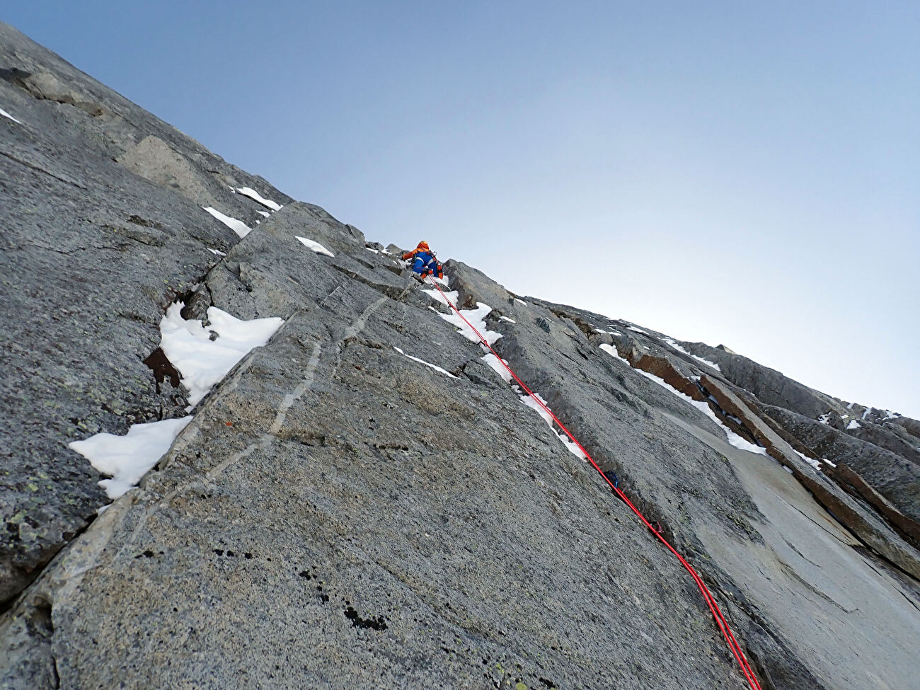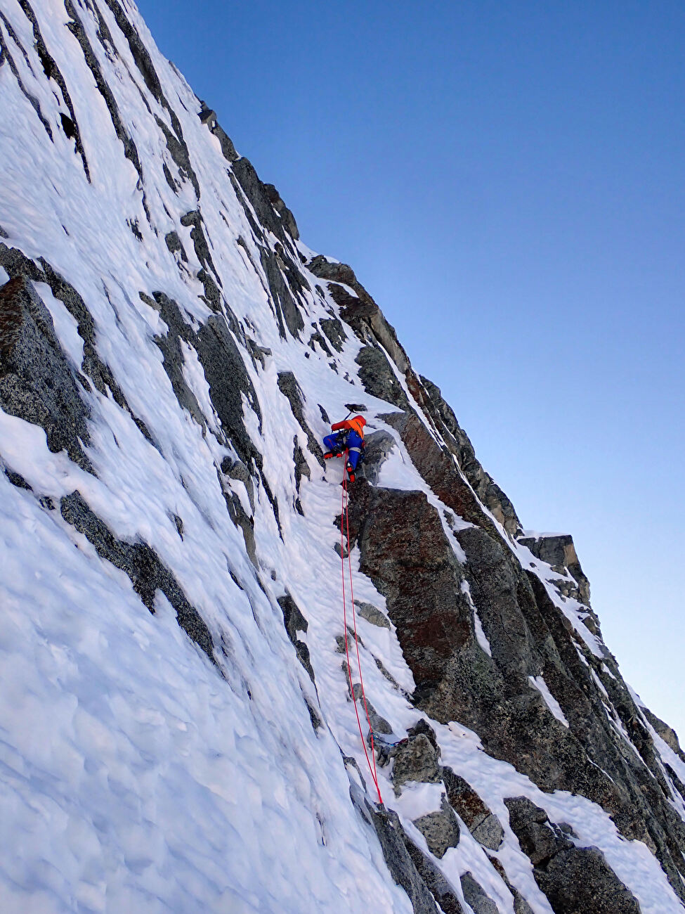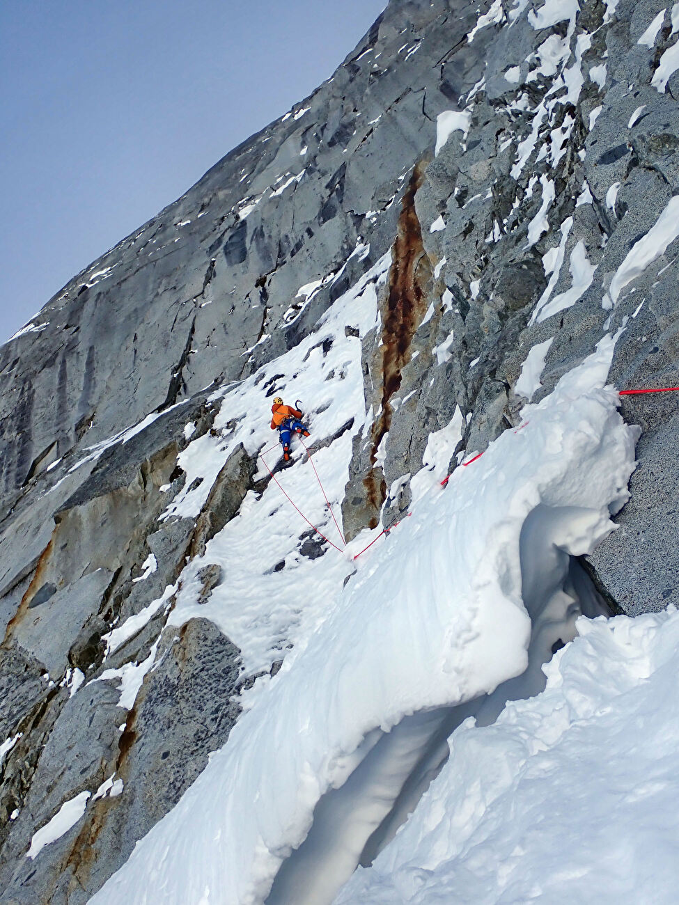 Comme prévu, le passage du bergschrund a nécessité des manigances, mais nous avons été récompensés par une belle hauteur de glace pure. Ceci a été suivi d’une longue traversée à travers un rebord enneigé qui nous a amenés sous un bouclier rocheux lisse et vertical, divisé par une fissure légèrement diagonale. C’est la seule ligne de faiblesse évidente sur cette section escarpée du mur et donc la ligne évidente Dell’eva et Taddei ont dû prendre en 1969.