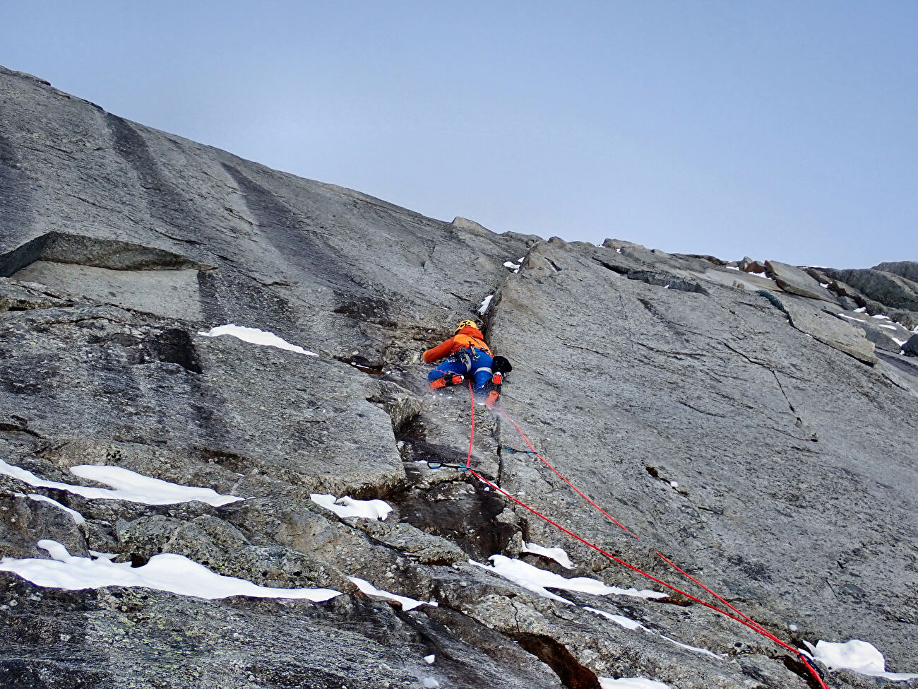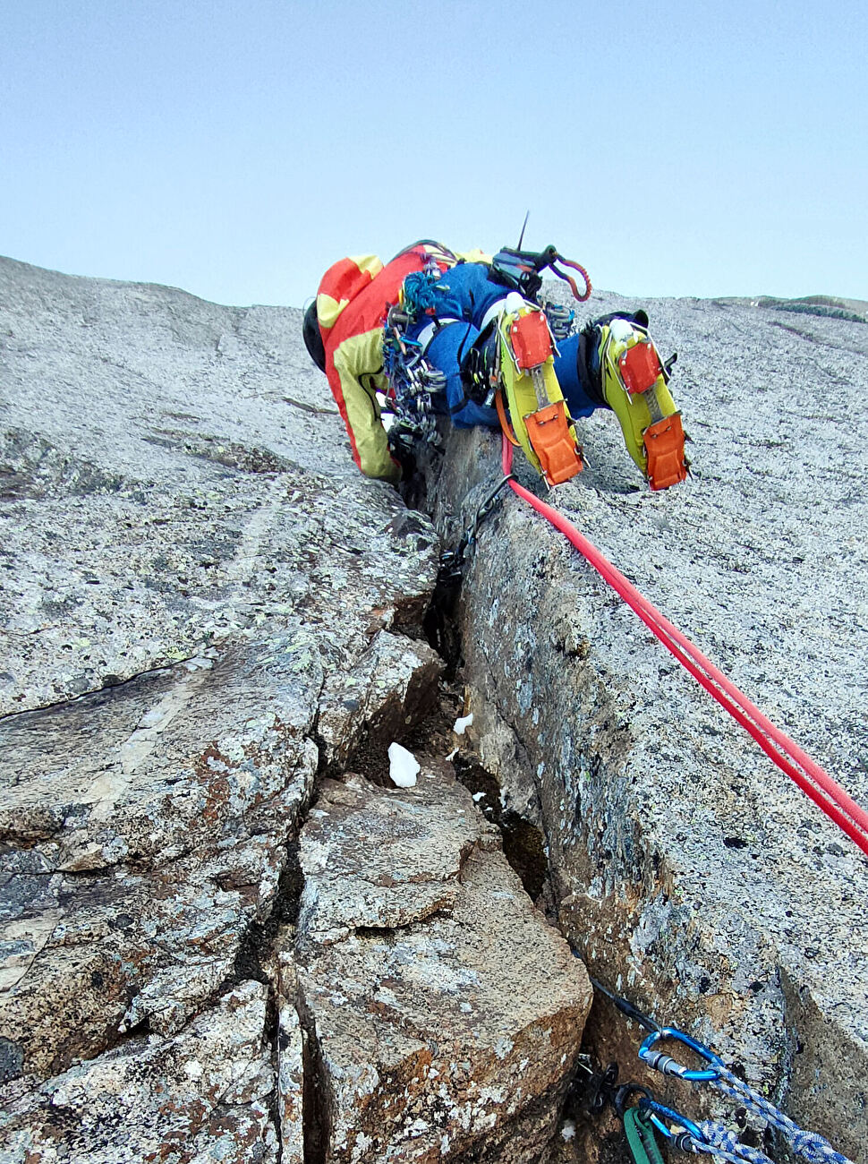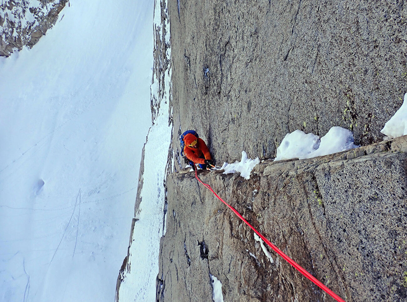 Comme prévu, le passage du bergschrund a nécessité des manigances, mais nous avons été récompensés par une belle hauteur de glace pure. Ceci a été suivi d’une longue traversée à travers un rebord enneigé qui nous a amenés sous un bouclier rocheux lisse et vertical, divisé par une fissure légèrement diagonale. C’est la seule ligne de faiblesse évidente sur cette section escarpée du mur et donc la ligne évidente Dell’eva et Taddei ont dû prendre en 1969.