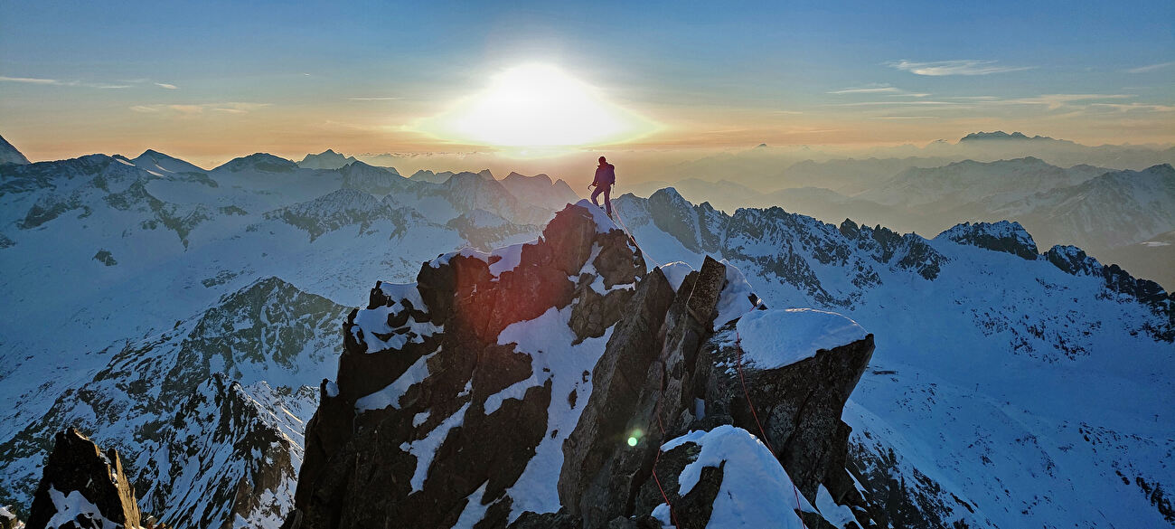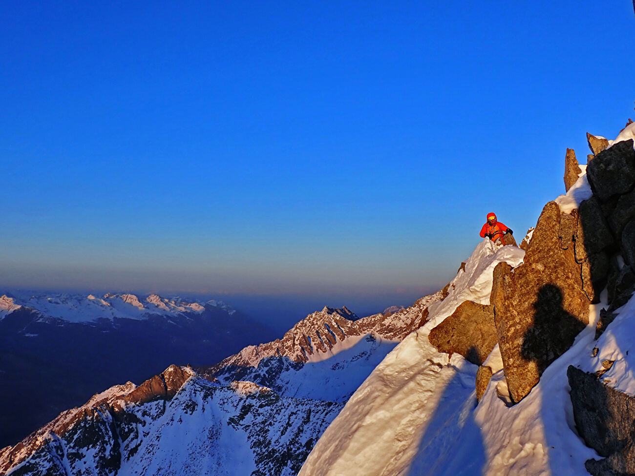 La conséquence du début tard a été que nous avions apprécié un coucher de soleil spectaculaire sur la crête de Summit, où le ciel exceptionnellement clair nous a permis de voir jusqu’au massif de Monte Rosa. Ce fut vraiment la fin parfaite pour une journée aussi satisfaisante sur la face nord de Busazza.