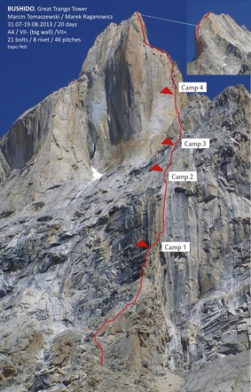 Les polonais Marek Raganowicz et Marcin Tomaszewsk ont réalisé la première ascension de Bushido, une nouvelle voie sur la Grande Tour de Trango.