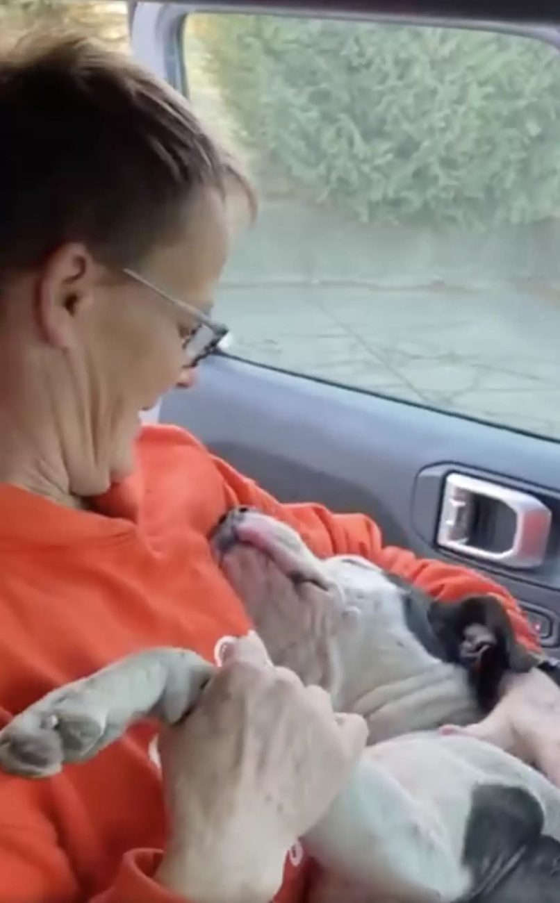Au lieu de se ruer sur les saucisses, la chienne — que Donna appellera plus tard Cutie Pie — lève les yeux, puis s’avance… en ignorant complètement les friandises. Doucement, elle s’approche, et vient blottir sa tête contre le torse de Donna.