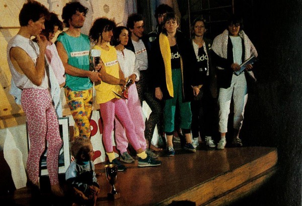 De gauche à droite: Jacky Godoffe, Isabelle Patissier, Philippe Steulet, Robert Cortijo, Renée Guérin, Martin Atkinson, Cristophe Frendo, Françoise Lepron, Françoise Pevsner, Christine Grouiller. Podium de Vaulx-en-Velin. 1986