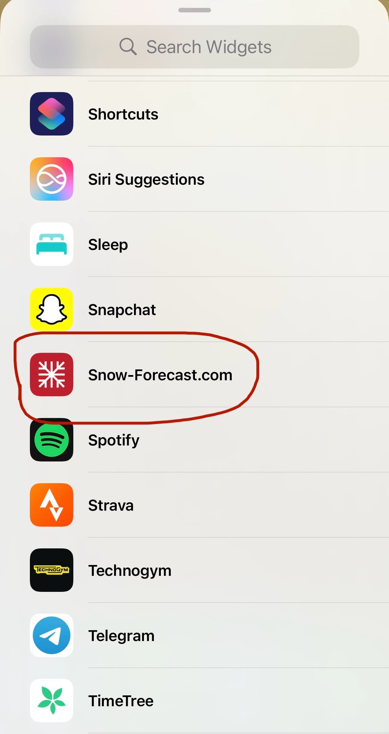 - Faites défiler vers le bas ou utilisez la barre de recherche pour trouver l’application Snow-Forecast.com dans le prochain menu contextuel.