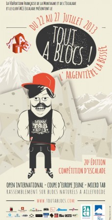 Pour sa 20ème édition, le Tout à Blocs se déroulera du 22 au 27 Juillet 2013 à l’Argentière la Bessée. Au programme : une Coupe d’Europe Jeunes, un Open International, un Micro TAB et un rassemblement à Ailefroide sur blocs naturels.
