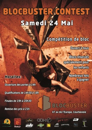 La salle parisienne Blocbuster située à Courbevoie en banlieue parisienne organise un contest de bloc le samedi 24 mai prochain. Début à 14 h puis finales en soirée. Inscriptions sur place, compétition enfants. Rémi Samyn, coordonnateur du pôle France bloc sera le chef ouvreur.