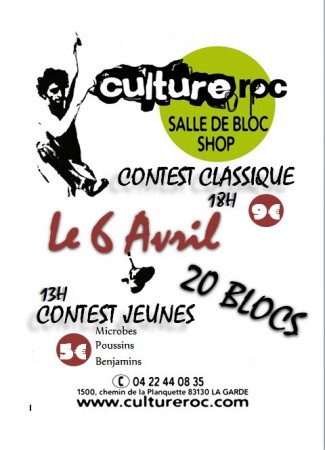 La salle de bloc varoise (située à La Garde) Culture Roc organise le 6 avril prochain dès 13 h un contest de bloc destiné aux microbes, poussins et benjamins. Puis à 18h, place aux grands !