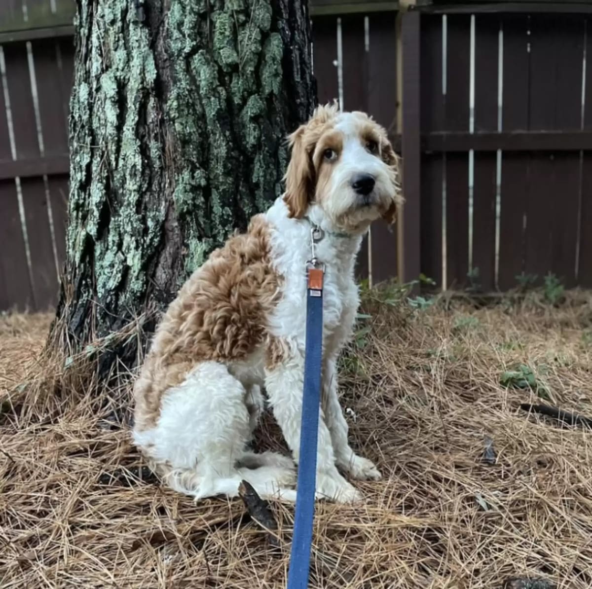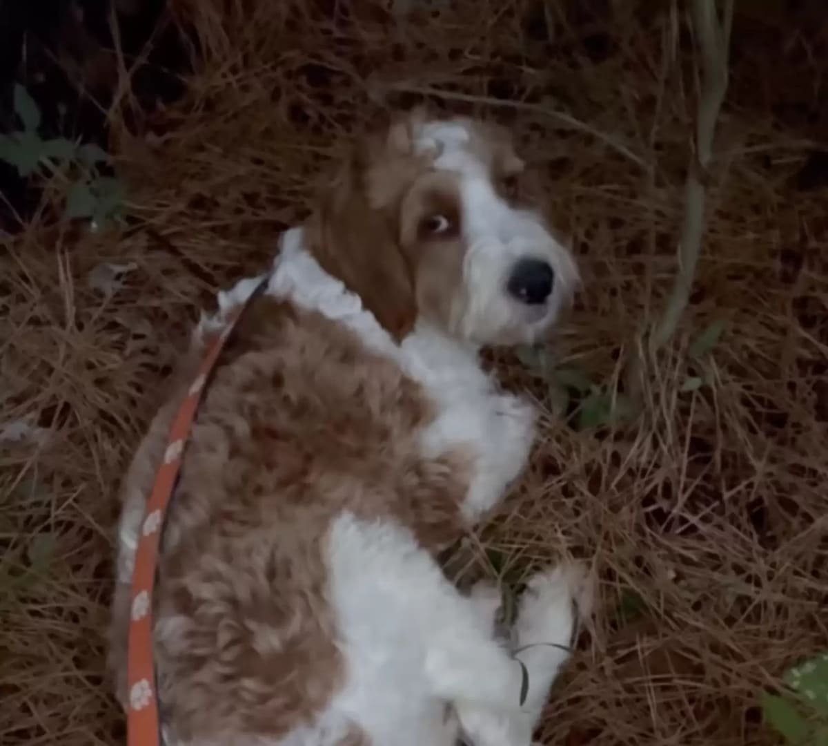 Dans une situation tragique, un éleveur a abandonné Parker, un chien au pelage frisé brun et blanc, ainsi qu’un groupe d’autres chiens dans les bois de la Caroline du Sud. Perdu et sans repères, Parker a erré dans la région, sans savoir comment réagir face à sa situation désastreuse. Ne trouvant aucun abri, il a fait le choix de se reposer sur un lit d’aiguilles de pin, trouvant refuge dans ce coin de forêt.