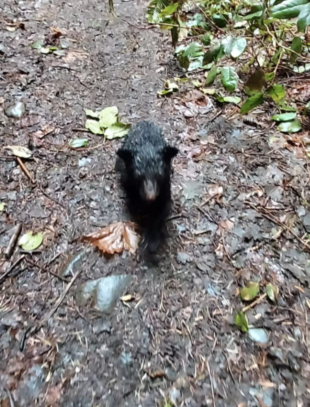 Alors qu’il marchait sur le sentier, il aperçut un petit animal noir et duveteux, assis tout seul dans la boue, au pied d’un arbre. Intrigué, il s’approcha et réalisa avec stupéfaction qu’il s’agissait d’un ourson. Bien qu’Evison, qui vit dans cette région et fait régulièrement des randonnées, ait déjà vu des ours à plusieurs reprises, il n’avait jamais rencontré un petit ourson tout seul. Il savait que, généralement, la mère de l’ourson n’était pas loin, et qu’il ne devait pas intervenir. Il continua donc sa marche, espérant que le petit ours retrouverait sa mère rapidement.