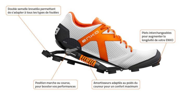 La running Enko est dotée d’un système exclusif d’amorti, mécanique et paramétrable. Une double semelle brevetée, composée de plus de 50 pièces et intégrant un jeu de ressorts calibrés en fonction du poids du coureur doit faire la différence. Et absorber mieux les chocs « que toute autre chaussure au monde ».