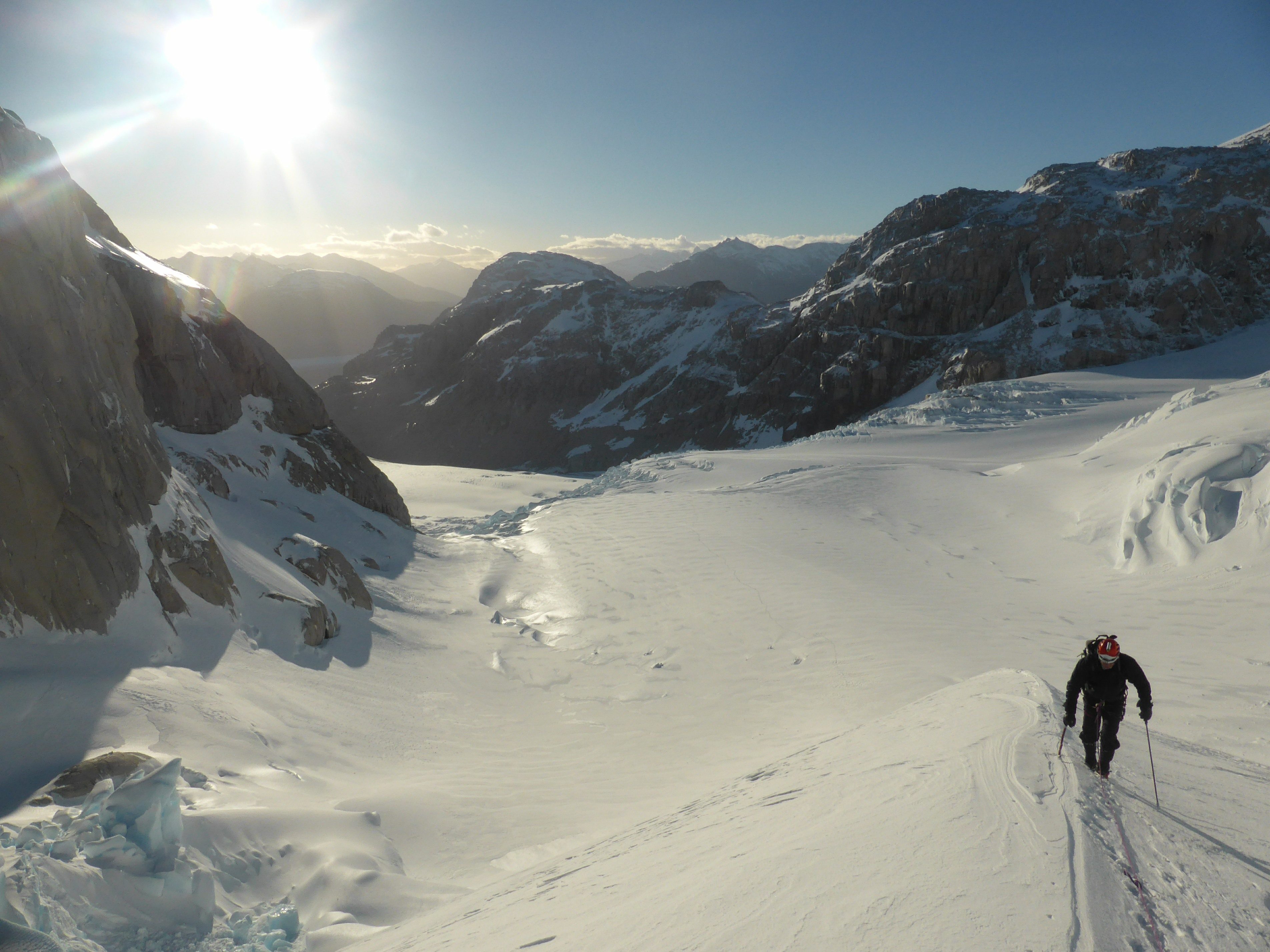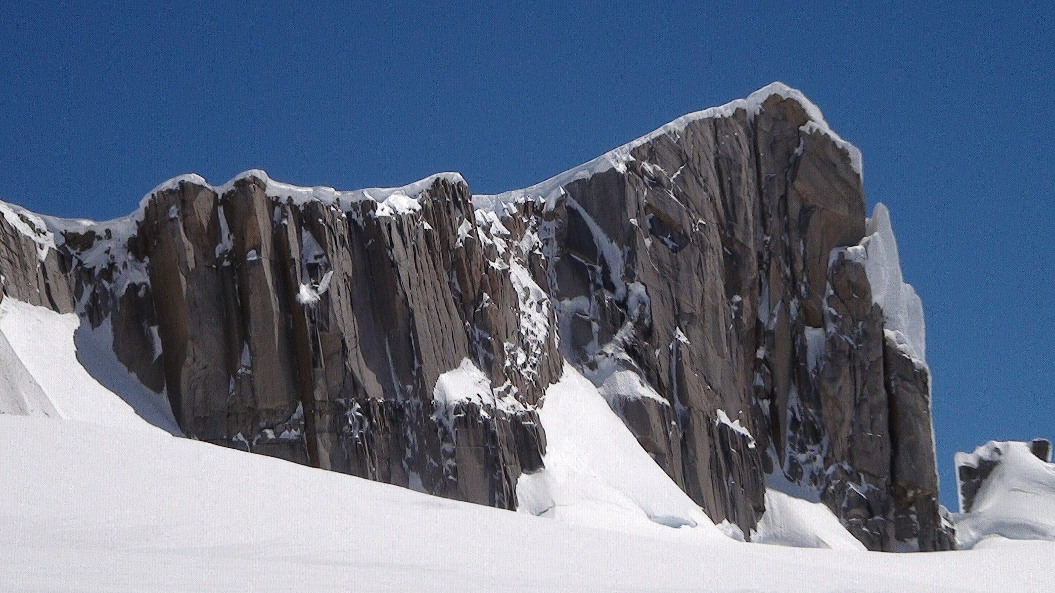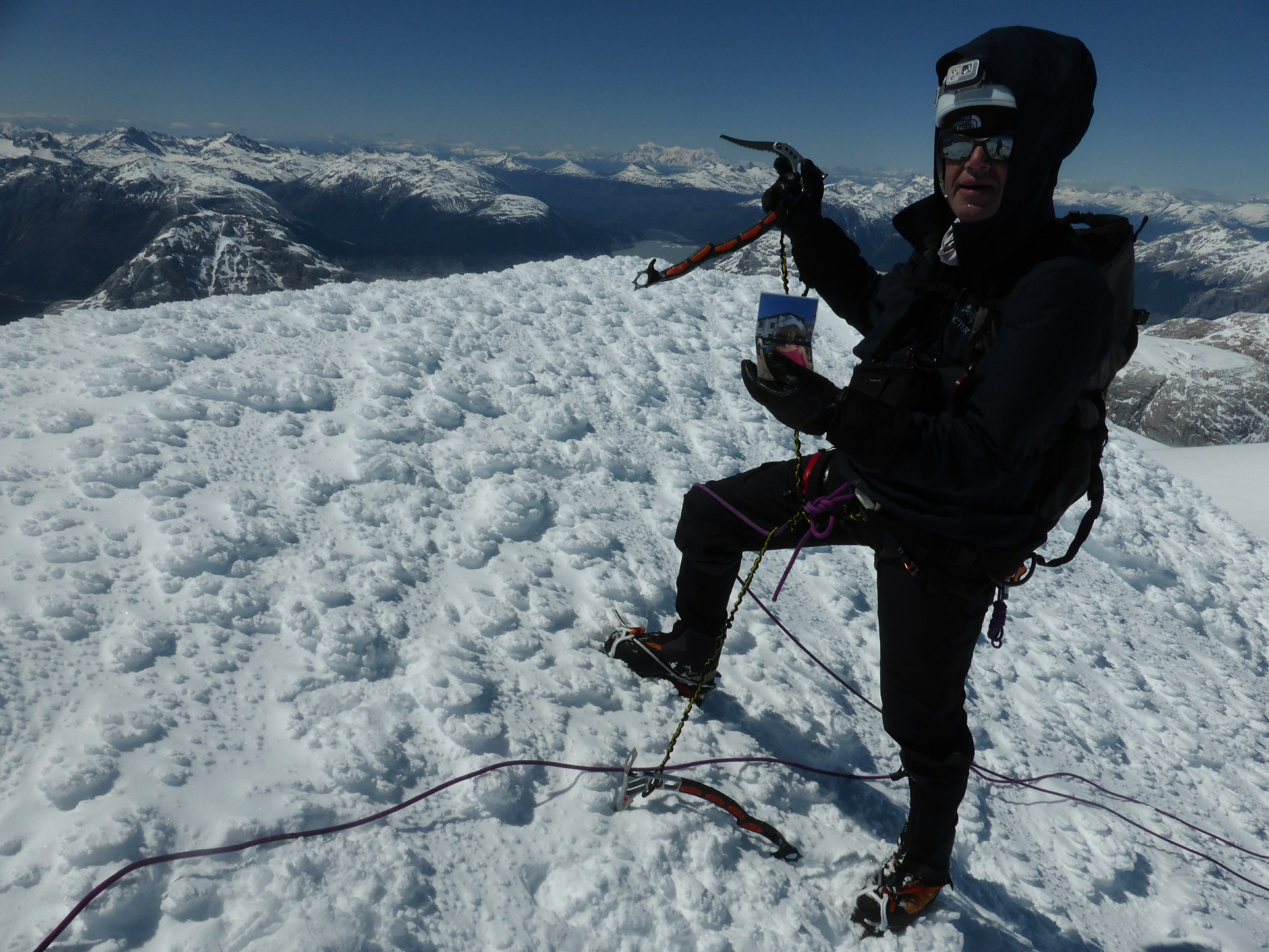 Mais en arrivant au pied de la face, après avoir parcouru plus de 10 km de distance et 1300 m de dénivelée depuis notre dernier camp sur le glacier, nous avons découvert des conditions de neige trop dangereuses. La face était couverte d’une neige transformée par les vents, caractéristique des Andes de Patagonie, suite aux tempêtes de ces derniers jours. Nous avons décidé de ne pas y aller.Nous avons alors fait l’ascension d’un joli sommet, situé une centaine de mètres plus haut juste à notre Nord. Par une arête glaciaire, recouverte de cette neige transformée par les vents et caractéristique des Andes de Patagonie, mais protégée et sans difficulté majeure à 50° max, nous avons atteint son sommet, que nous avons baptisé, en l’absence d’ascension connue, la pointe Anne, la dédiant à Anne, 7 ans, porteuse de la trisomie 21, et via Anne, à ses parents qui ont fait le choix de l’adoption.