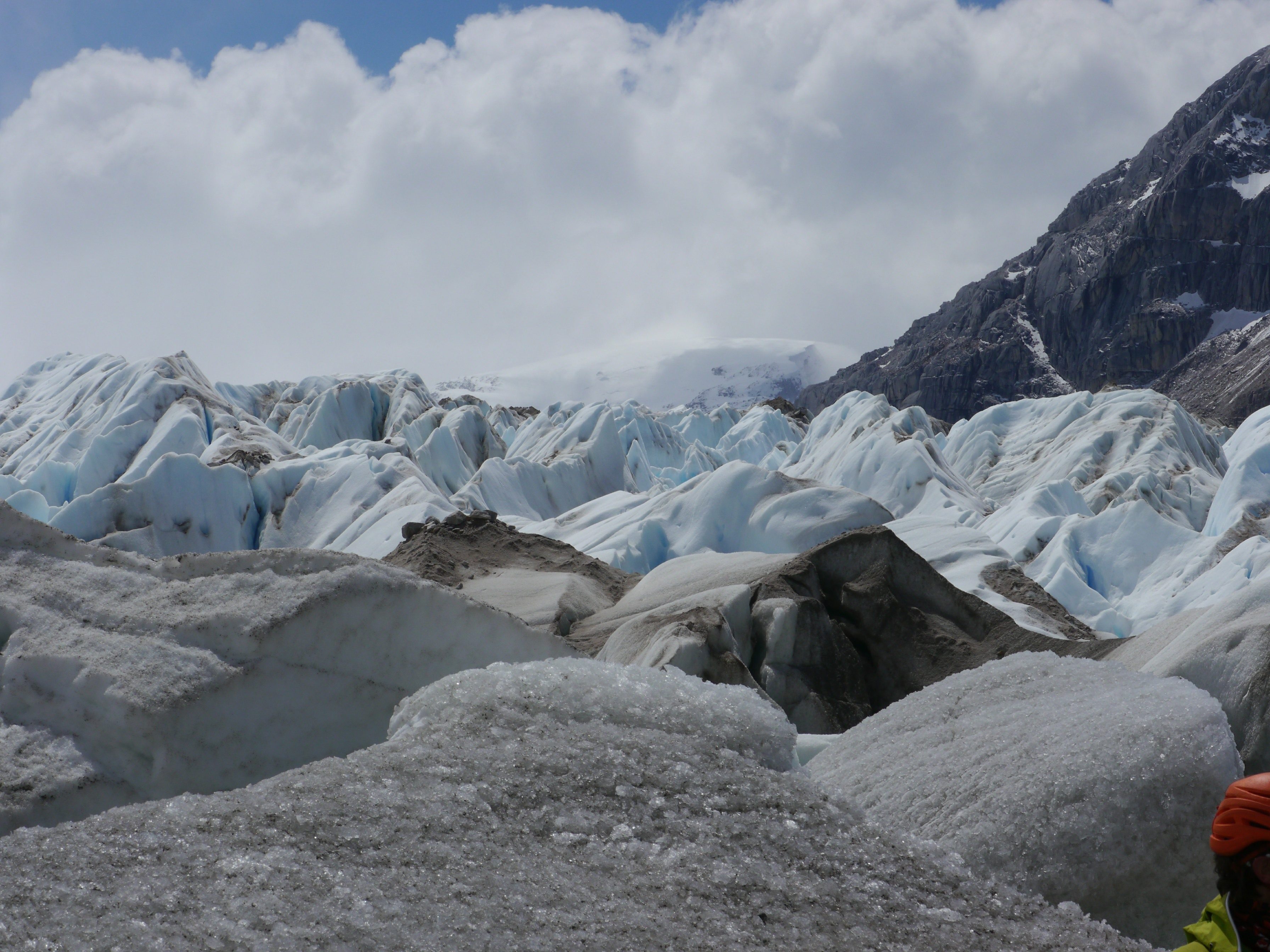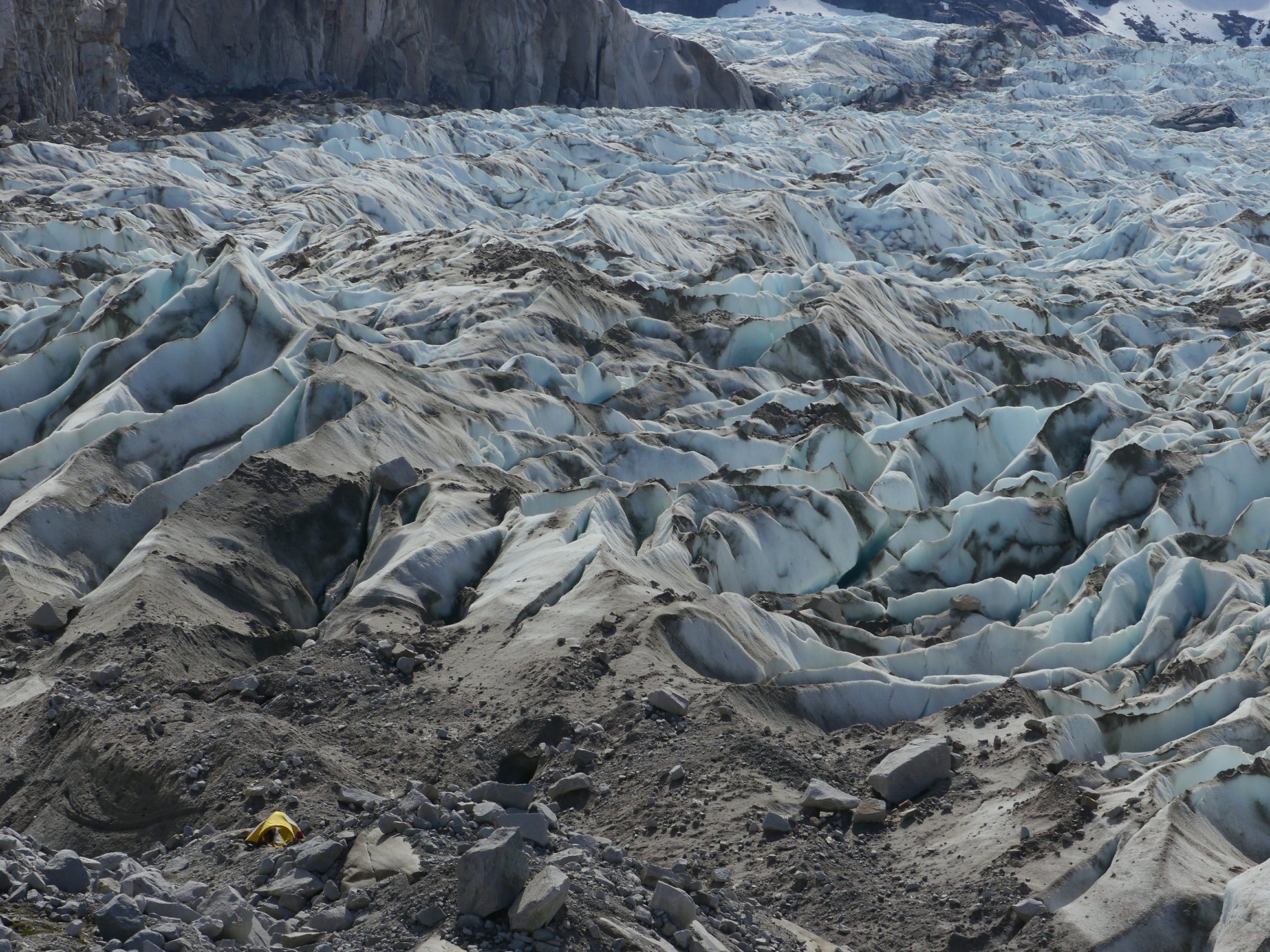 Sur le plan montagne, après des journées d’attente sous la tente en raison des tempêtes, nous avons eu la chance de pouvoir bénéficier d’une rare et courte fenêtre météo d’une journée. Avec Gabriel, nous en avons profité pour monter, depuis notre dernier camp, sur le Champ de glace Nord et découvrir cette incroyable immensité de glace. Nous sommes passé par un col à propos duquel nous n’avions trouvé aucune information d’expédition qui y soit auparavant passée.