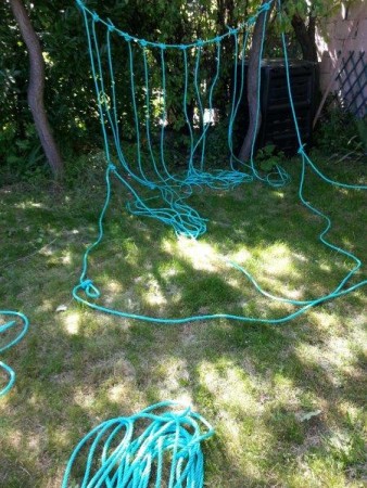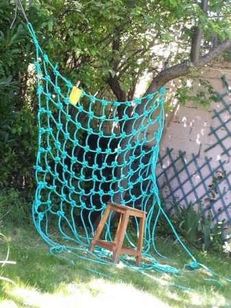 Voici quelques indications pour fabriquer un « filet de grimpe » pour enfants. La dimension finale est de 2 mètres sur 2 mètres au final.