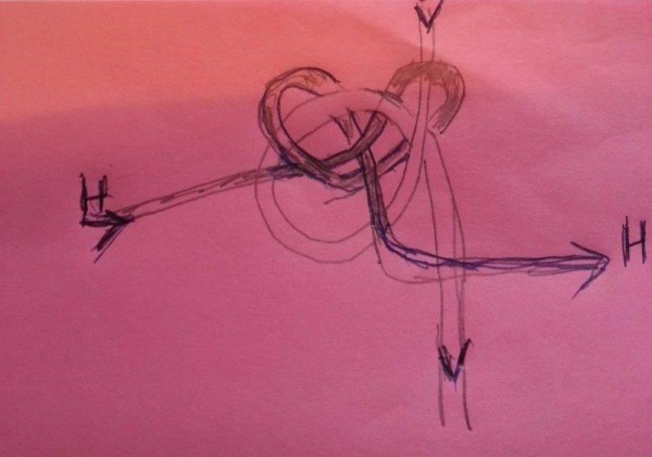 Faire une boucle sur le brin V le brin venant du haut sur le dessus ; puis y entrer le brin H par le dessus ; faire le tour du brin V par le dessus, rerentrer dans la boucle par le dessous ; aller faire le tour du brin de boucle de V et du brin H qui y rentrait et ressortir finalement de la boucle ( ou plutôt des deux boucles puisqu’on en a fait une seconde !).