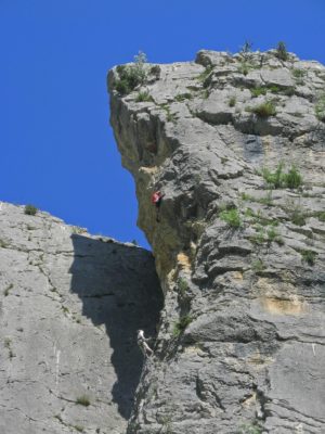 De l’escalade pour tous. Du 4 au 7, de la couenne de 30 m à la voie en 3 petites longueurs. On trouve de la dalle presque lisse, des bombés constellés de gouttes d’eau, de la fissure, du dièdre…..