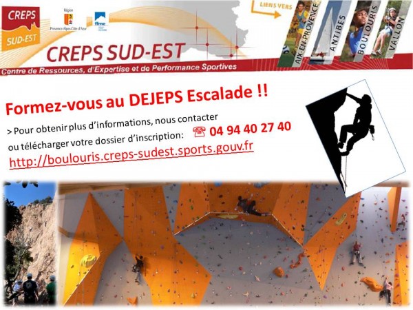 Le CREPS Sud-Est propose en 2013/2014 une 2ème formation DEJEPS Escalade dont les modules se dérouleront en région PACA à Aix en Pce et à Boulouris.