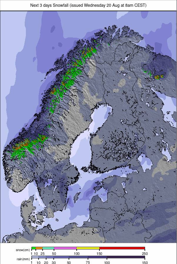 Prévision des températures plus fraîches du glacier Galdhøpiggen devrait signifier des chutes de neige légères en milieu de semaine, avec jusqu’à 7 cm (3 ”) prévue d’ici vendredi. Les températures varient de 0 ° C à 10 ° C, avec des niveaux de congélation autour de 1 900 à 200 m.