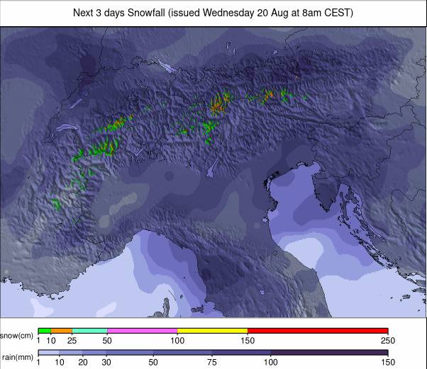 Bien qu’il y ait plus de prévisions de soleil, il y a aussi des précipitations, mais avec le point de congélation supérieur à 4 000 m, la pluie et le grésil sont plus susceptibles que les chutes de neige à des niveaux élevés à l’heure actuelle. Malgré cela, les centres glaciers peuvent parfois obtenir de la neige, en particulier vers le week-end, avec 5 à 10 cm (2–4 ”) qui devraient actualiser la couverture.