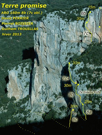 Cet hiver et printemps, David Perrier, Pierre Boissier et Guilhem Trouillas ont ouvert une magnigique grande-voie dans les gorges de l’Ardèche : ‘Terre promise’, 160 m, 8b, 7c obligatoire.