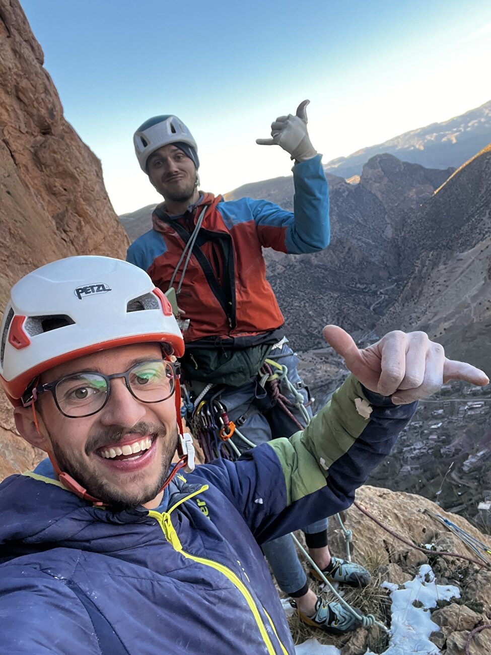 La météo s’est avérée meilleure que prévu, nous permettant de répéter plusieurs classiques comme Rivières Pourpres, Barakaet Avoir ou être. Lors de notre thé habituel de l’après-midi sur le toit-terrasse, nos yeux étaient constamment attirés par la face nord dominante d’Oujdad. Sur son côté gauche se trouvent trois piliers saillants. Après avoir consulté le guide, nous avons réalisé qu’au moins deux de ces piliers ne semblaient pas avoir été escaladés.