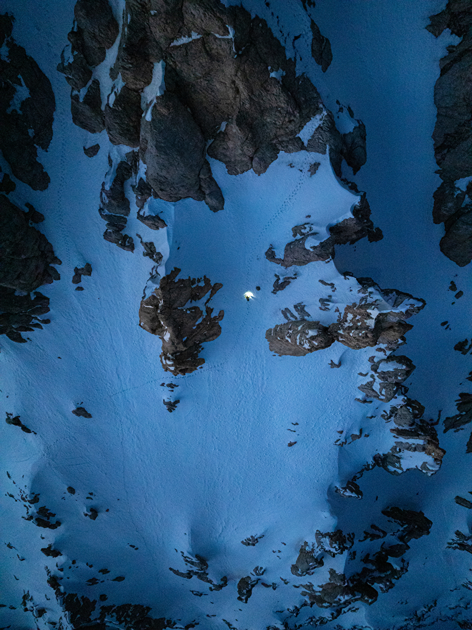 Après avoir passé la nuit au refuge Campo Imperatore, Barmasse a de nouveau reparti vers l’est, reliant Monte Aquila, Brancastello, Torri di Casanova, Monte Infornace, Monte Prena, Monte Camicia et, dernier mais surtout, Monte Tremoggia. L’ensemble du voyage équivaut à une alliance logique de 67 km en haut et en descendant, souvent compliquée, avec un gain d’élévation total de 7 200 mètres. Il portait tout ce dont il avait besoin pour rester autosuffisant, y compris un poêle pour faire fondre la neige et les fournitures pendant deux jours.
