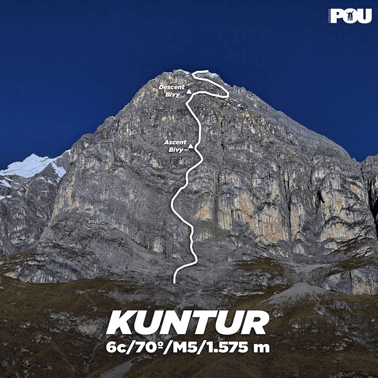 Eneko et Iker Pou ont fait une première ascension de trois jours sur le style alpine de Nevado Jurau A (5 520 m) dans la chaîne de montagnes Wild Cordillera Huayhuash dans les Andes du Pérou. Les frères basques ont rencontré des difficultés en haut de 6c, 70 °, M5 le long de la montée de 1 575 m, qu’ils ont appelé Kuntur, condor dans la langue quéchua indigène, en l’honneur des quatre condors massifs qui ont grimpé au-dessus d’eux pendant une grande partie de la montée.