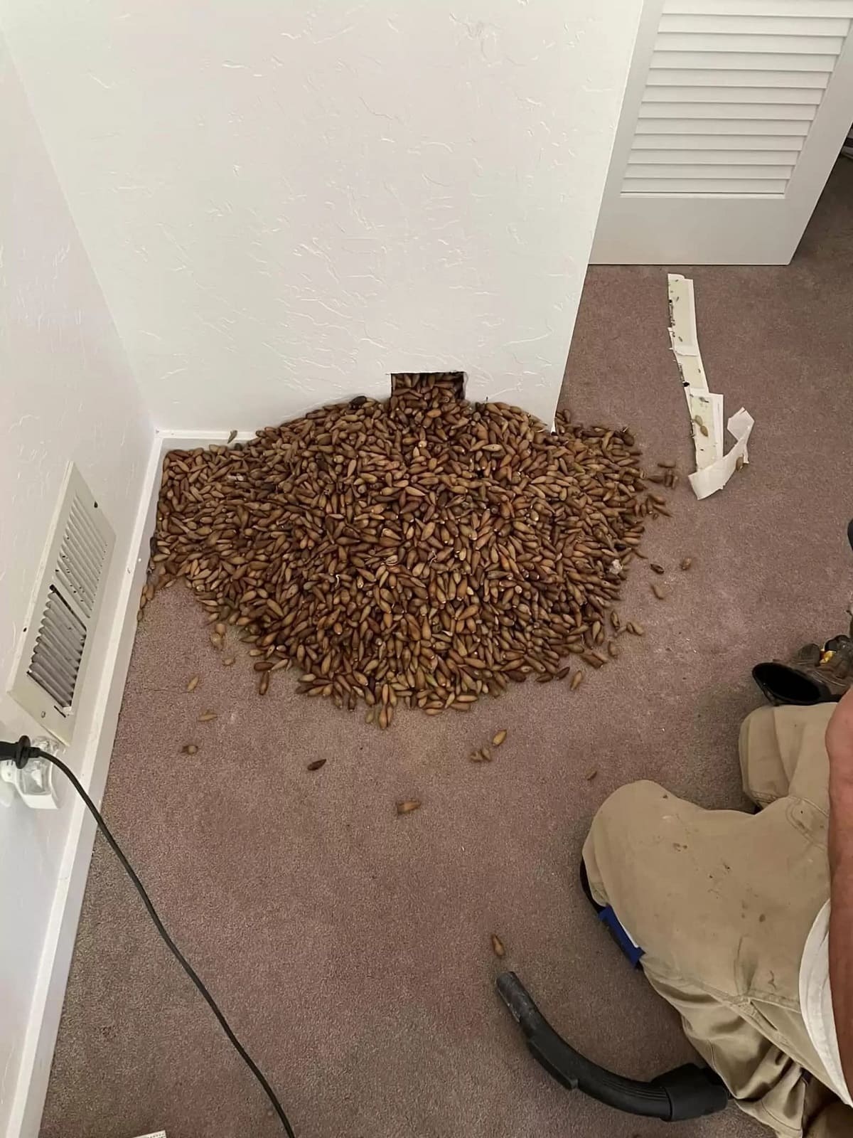 « Ça ne s’arrêtait pas, ça continuait sans fin », raconte Castro. Il pensait que les glands étaient stockés seulement jusqu’à un quart du mur. Mais à sa grande surprise, ils étaient entassés jusqu’au grenier de la maison. Intrigué, il a ouvert plusieurs autres trous autour de la maison, et les glands ont continué de tomber.