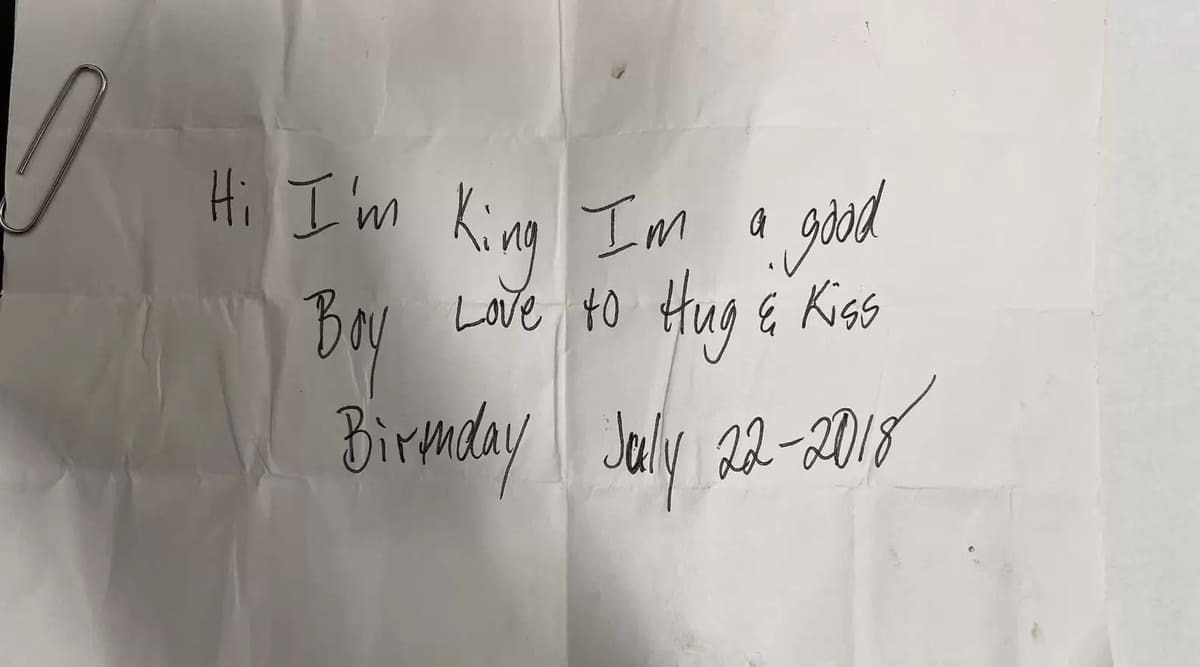 « Bonjour, je m’appelle King. Je suis un bon chien. J’aime les câlins et les bisous. Né le 22 juillet 2018. »