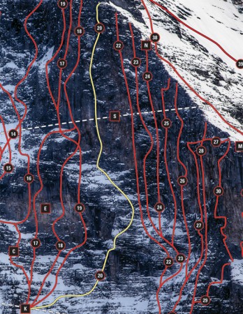 La voie débute par l’itinéraire de Heckmair (alias ‘Voie Original’; ED: 5.8- 70-degrés en glace, 1800m, Harrer-Heckmair-Kasparek-Vorg, 1938), continue après le Stollenloch- la fenêtre qui donne sur le tunnel du train de la Jungfrau–a droite de la voie Rote Fluh.