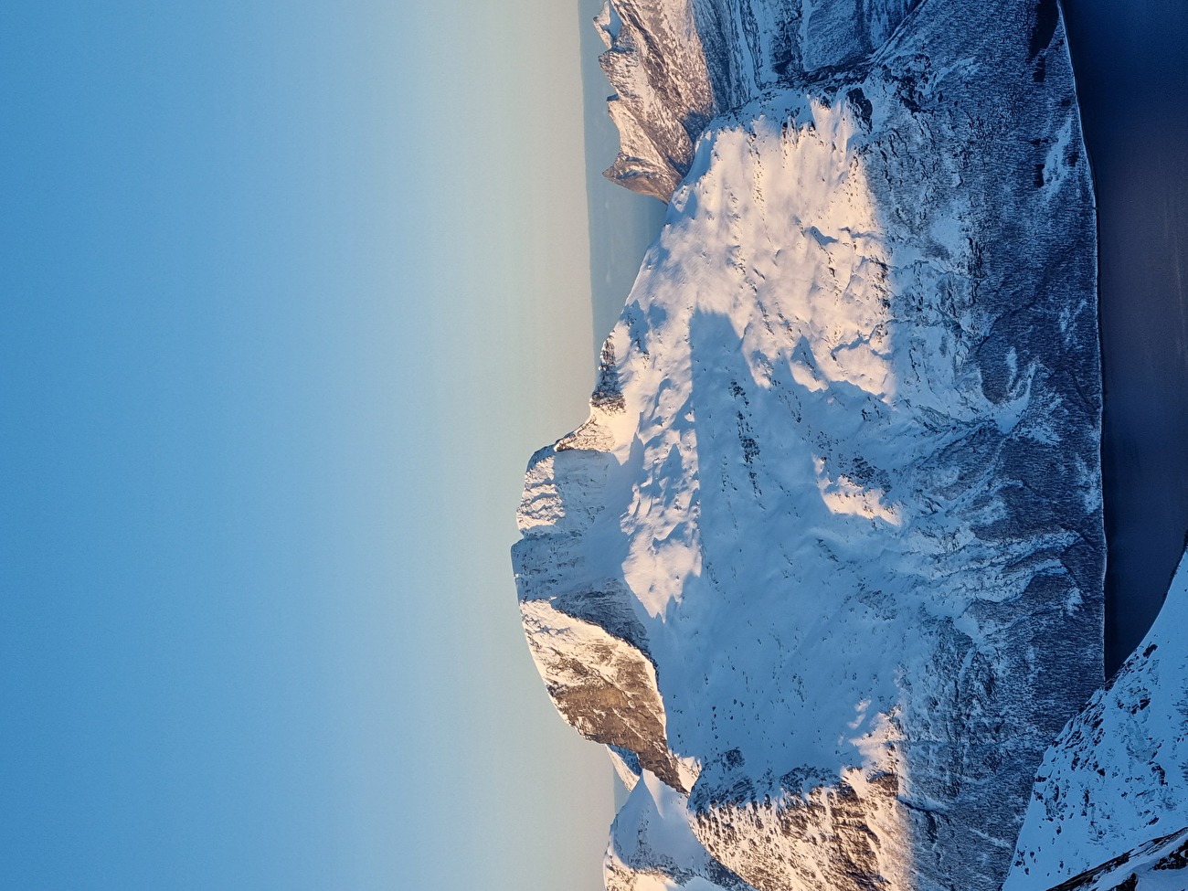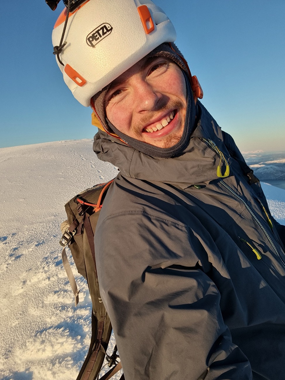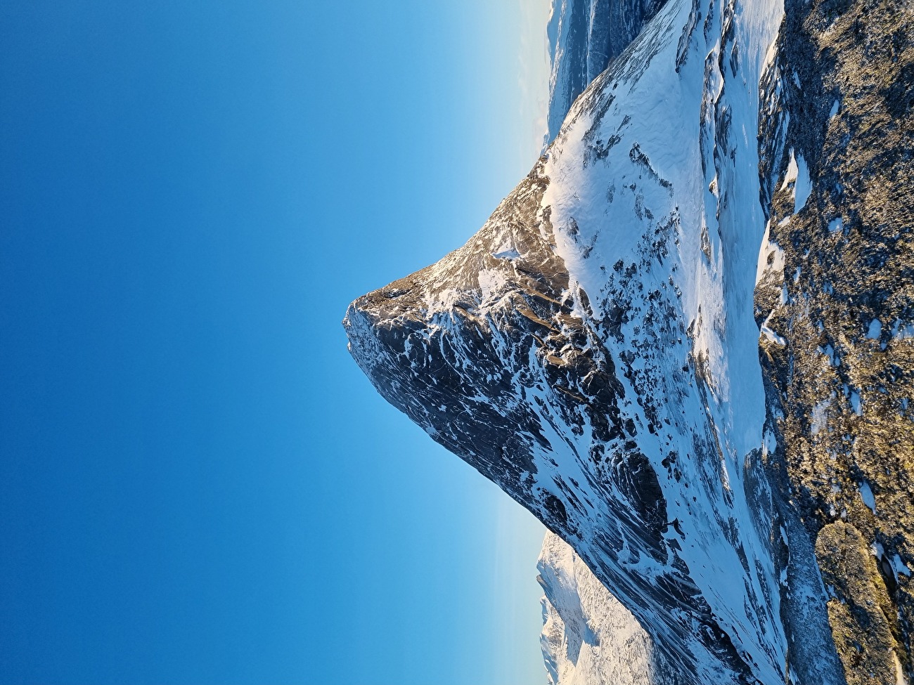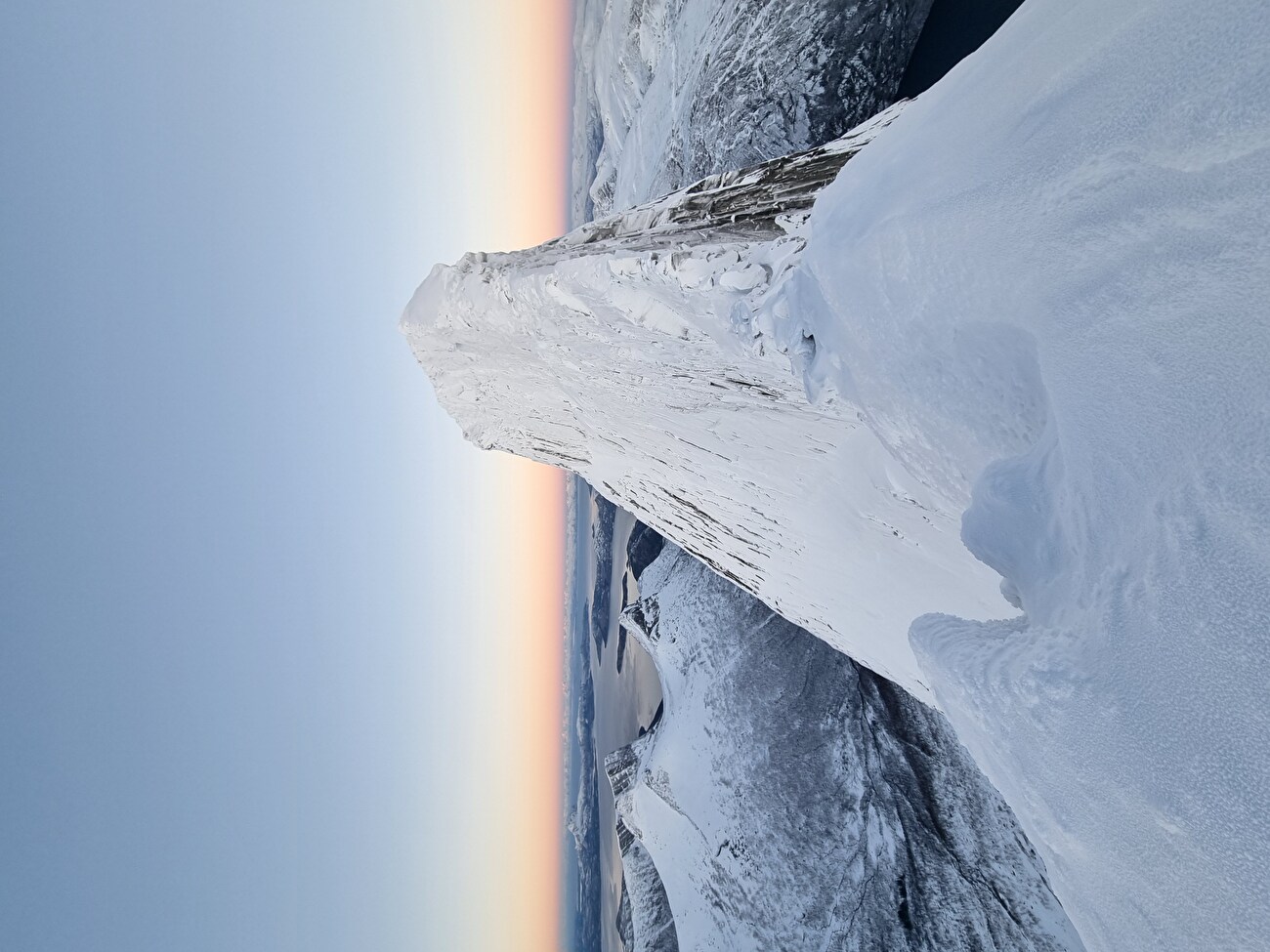 Après Stetind, l’école et les examens ont pris le relais pendant quelques jours, mais une autre fenêtre est apparue. Le 29 janvier, j’ai pris un ferry précoce pour Kjerringøy, où j’ai été accueilli par un pêcheur local qui m’a donné un dernier repos avec son bateau à travers le fjord. Après environ 2,5 heures de randonnée, j’ai atteint la base de la crête de l’ouest. Le vent a repris et j’ai grimpé la première section escarpée dans le Spindrift constant. Heureusement, plus haut, la montée était plus abritée. Avec un mélange de trucs solo gratuits et en corde, j’ai finalement atteint un sol plus facile et monté au sommet. Malgré le plein soleil, je suis tombé sur des vents déchaînés, mais avec de belles vues sur tout le parc national.