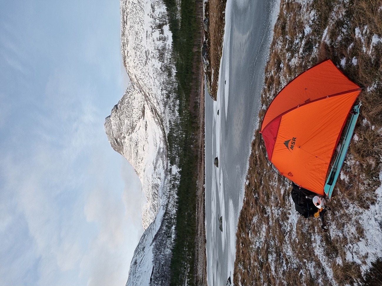 La dernière pièce du puzzle était Husbyviktind. À bien des égards, c’était le plus grand inconnu en raison du manque d’informations et de son emplacement éloigné. Husbyviktind est facilement atteint par bateau, mais faire un tour en hiver peut être un défi. Après d’innombrables appels et messages, j’ai abandonné et j’ai décidé d’essayer de l’aborder à pied de l’est. Avec un paquet lourd dans lequel j’ai fait une randonnée pendant environ 15 km, traversant les lacs et les marécages semi-jacents, avant de s’effondrer enfin dans ma tente. Le lendemain, j’ai fait la dernière poussée à la base de la montagne et, après avoir évalué les conditions, j’ai commencé la crête de l’ouest. Encore une fois, j’ai rencontré des vents féroces, ce qui m’a presque déséquilibré 80 mètres dans les dalles d’intro. J’ai essayé de l’attendre, mais j’ai finalement décidé de renflouer.