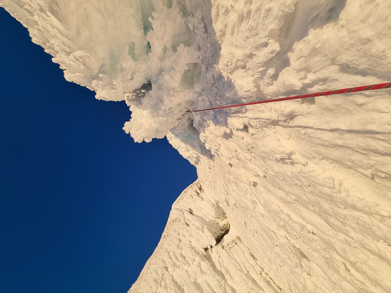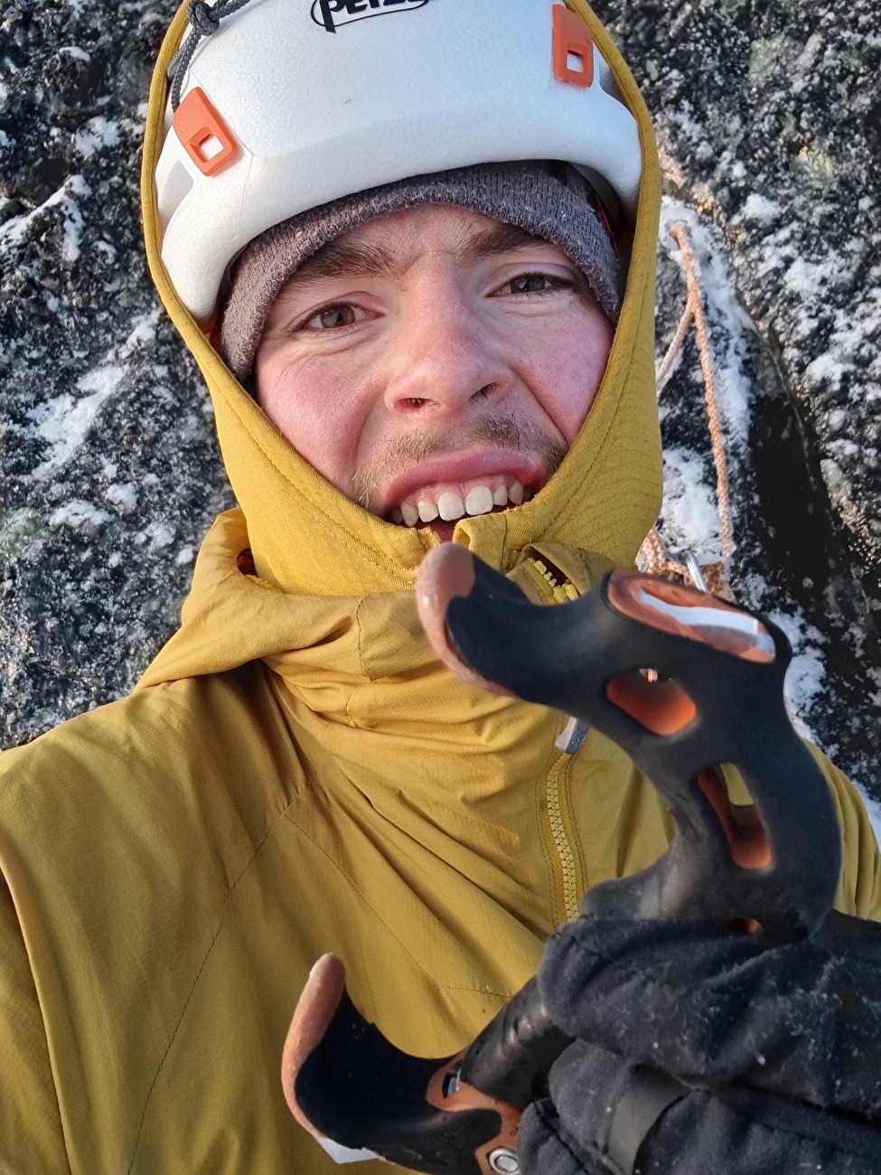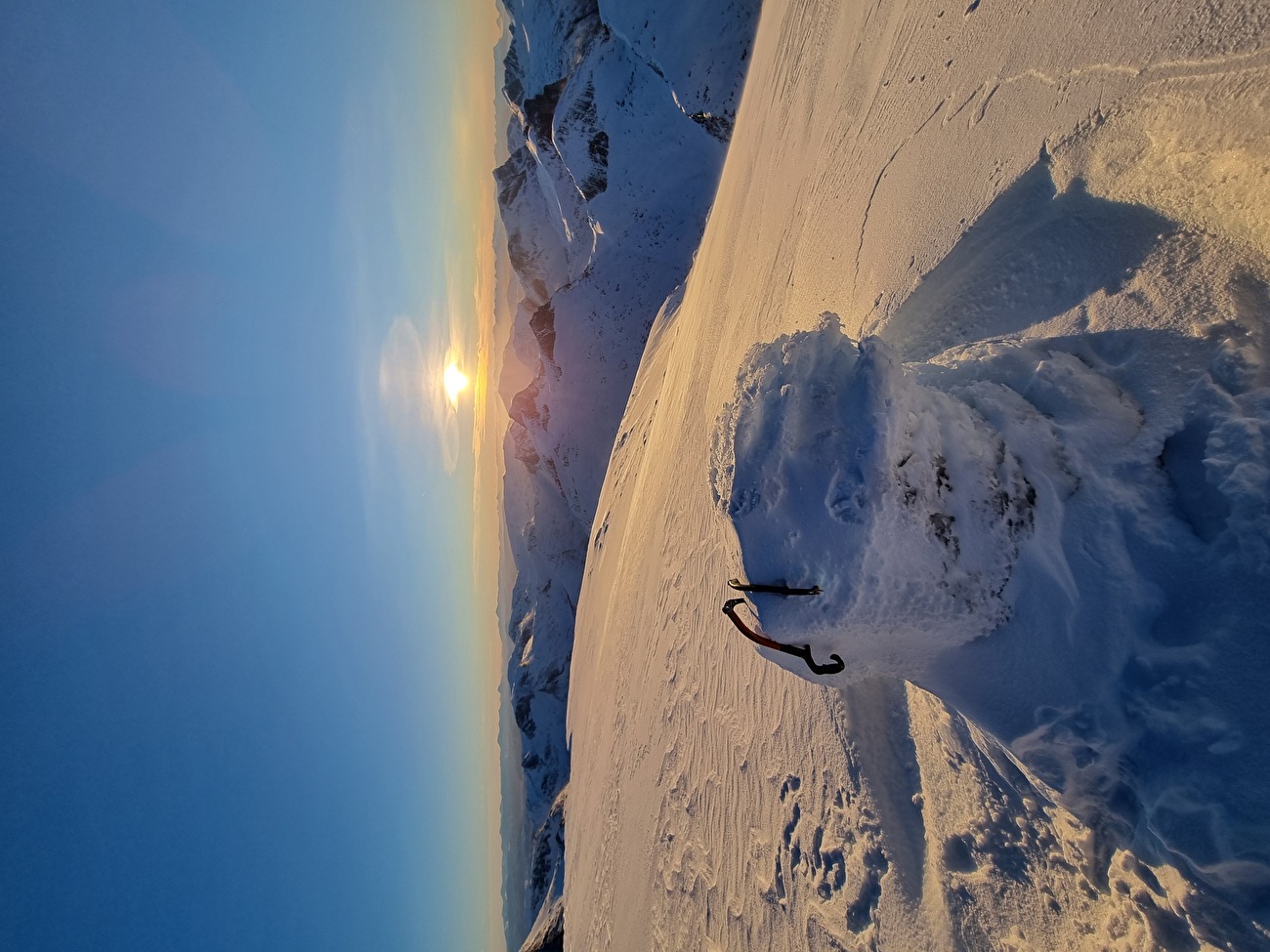 Ensuite, Preikstoltind. Tôt le matin le 22 janvier, j’ai traversé le paysage plat vers Nordskaret. Je me sentais engagé après avoir sauté l’école, et je devais être de retour avant 16 heures pour commencer à travailler. En arrivant à la base de l’East Ridge, je me sentais un peu intimidé, mais comme toujours, je l’ai fait étape par étape. Ce n’était certainement pas aussi mauvais qu’il semblait, bien que certains facteurs inattendus, comme briser ma hache de glace à mi-chemin du premier terrain, l’ont rendu un peu plus intéressant. Heureusement, avec une certaine trimestre assistée par les marguerites, j’ai réussi à grimper très bien avec la hache que j’avais laissée. Une fois à nouveau en toute sécurité, je suis retourné dans le temps pour le travail, souriant tranquillement tout au long du quart de travail.