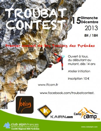Le Comité Régional Caf de Midi-Pyrénées organise le 15 décembre 2013, le premier Contest de dry tooling des Pyrénées à Troubat dans les Hautes-Pyrénées (65370), accessible à tous, du débutant au plus haut niveau, à partir de 14 ans: grimpe en crampons et piolets sur des lignes équipées de dry tooling.