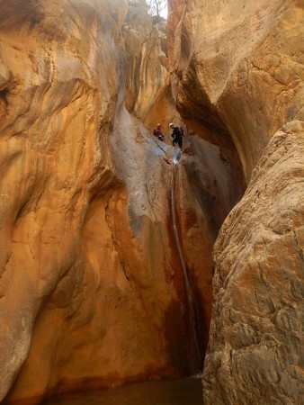 Kavousi est un sympathique petit canyon voisin de Portella. Giorgos nous avait proposé de nous monter avec son 4×4, on a adoré l’idée et on est monté dans la benne du pick-up pour l’approche. Arrivé en haut il nous parle de quelques trucs, nous montre les plantes qu’il ramasse pour la cuisine, nous raconte que l’eau coule mais qu’elle disparaît avant la fin, bref une journée de vacances réussie.