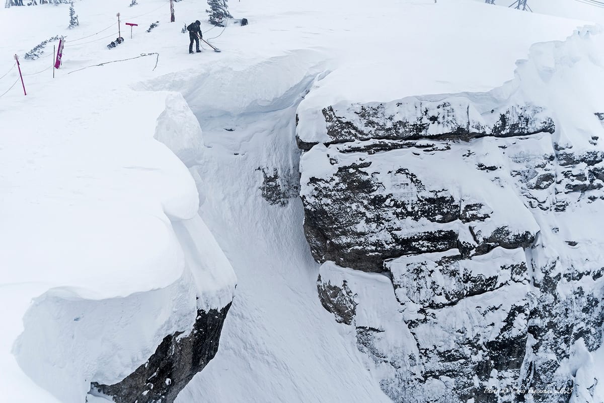 Le chef du département du parc et des pipes de Jackson Hole, Ranyon d’Arge, donne à Corbets Couloir une graisse en prévision des rois et des reines.