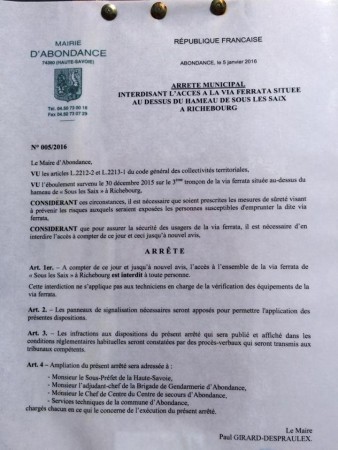 Vu l’éboulement survenu le 30 décembre 2015 sur le troisième tronçon de la Via Ferrata située au dessus du hameau de ‘Sous les Saix’ à Richebourg, la Mairie d’Abondance à publié un arrêté municipal interdisant l’accès à la Via Ferrata jusqu’à nouvel ordre