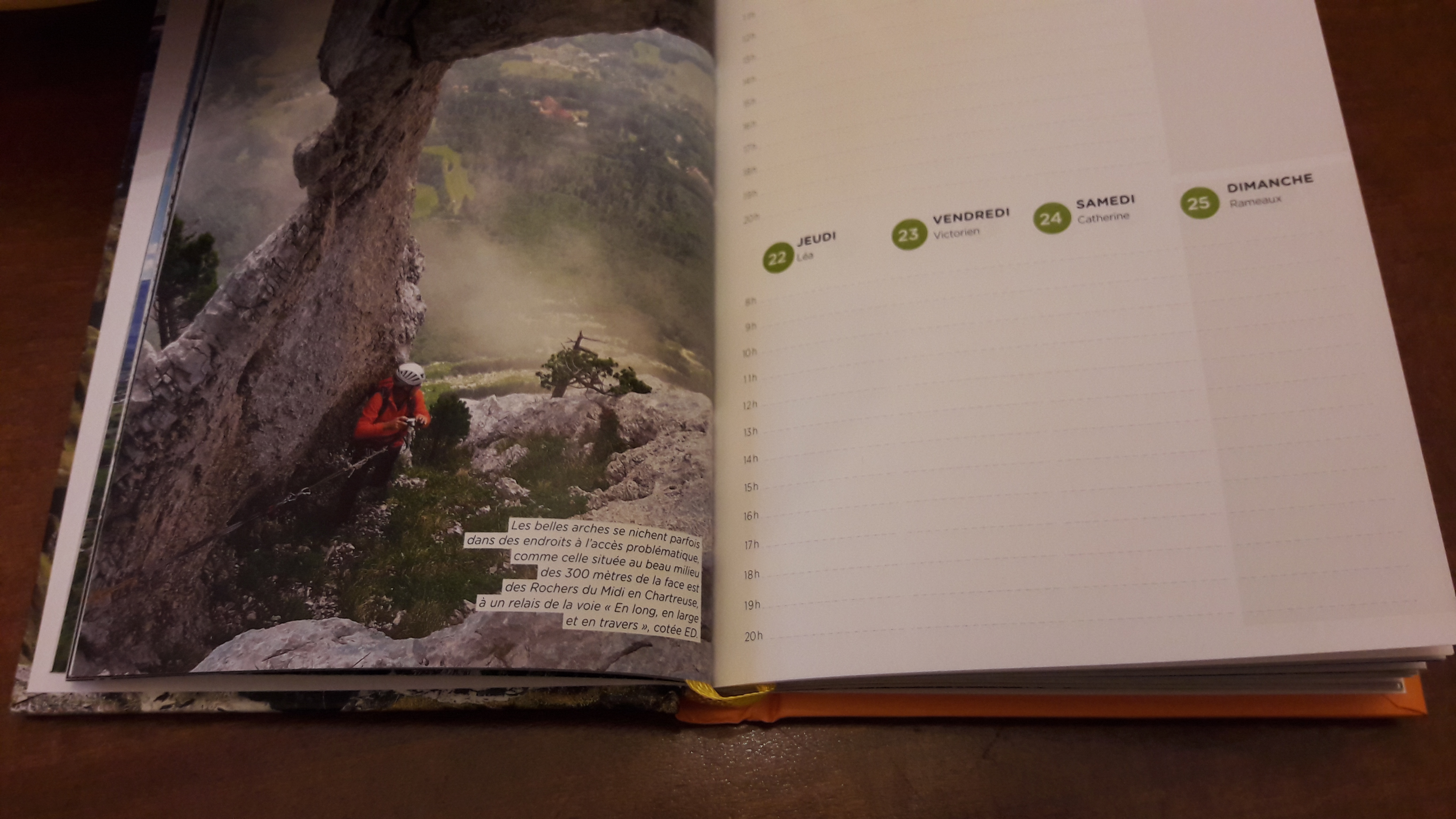 Dans cet Agenda, l’année est ponctuée de randonnées spectaculaires et insolites : Traversée de falaises sur des corniches de plusieurs kilomètres, amphithéâtres naturels, arêtes effilées, failles étroites entaillant une montagne, grottes, sculptures de glace…