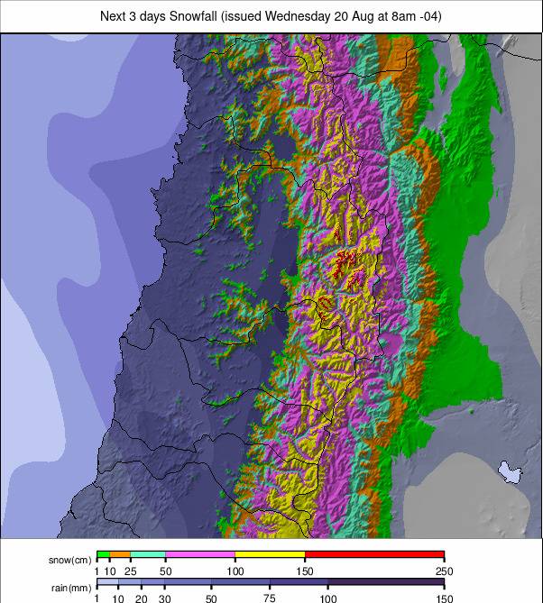 Des chutes de neige fraîches bien nécessaires sont attendues à travers les Andes, en particulier à Las Leñas, Catedral Alta Patagonia et Los Penisentes au cours de la seconde moitié de cette semaine, avec jusqu’à 42 cm (15 ”) dans les prévisions totales à Las Leñas, avec d’autres stations importantes ayant vu 15 à 24 cm (6-10”). Les chutes de neige se riposteront légèrement d’ici le week-end mais resteront stables à des altitudes plus élevées. Une masse d’air froid s’installera sur la Patagonie, avec des températures de montagne allant de –9 ° C à + 4 ° C en fonction de l’altitude.
