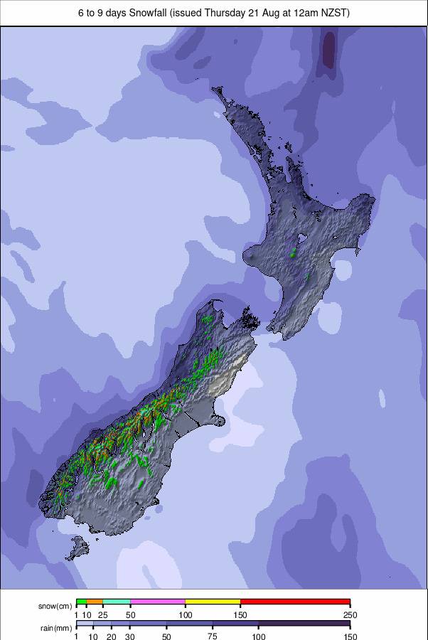 Prévision de la neige de la Nouvelle-Zélande pour les 6 à 9 prochains jours.