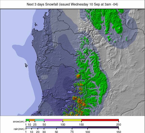 Un système hivernal fournira 10 à 20 cm (4 à 8 « ) en milieu de semaine, avec des vents forts parfois. Les températures varient de –6 ° C à 4 ° C, avec des refroidissements de vent inférieurs à –10 ° C dans les zones exposées.
