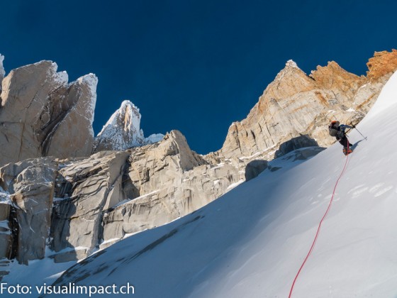 Profitant de conditions climatiques favorables, le trio a vaincu les difficultés de la voie (600m 90? M4), exploit déjà réalisé par Thomas Ulrich, David Fasel, Greg Crouch et Stephan Siegrist en 1999 mais qui s’étaient arrêtés a 8 mètres du sommet pour cause de tempête anticipée.