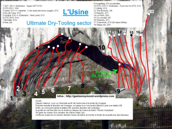 Tout grimpeur Grenoblois a déjà vu cette grotte situé à Voreppe, mais celle-ci n’avait pas encore succombée à la célèbre frénésie Grenobloise des varappeurs à mains nues tailleurs de prises. Du coup, c’est avec les bras affamés de dévers que des dry-tooleurs Grenoblois se sont abattus sur cette grotte. En peu de temps quasiment 20 voies sont apparues avec même des voies d’initiations et aussi peut-être la voie la plus difficile du monde (D14*). Tous les niveaux sont présents et pendant les week-ends d’hiver il n’est pas rare de compter plus de 10 personnes présentes de tout âge et sexe (de quoi faire pâlir les varappeurs de la cuvette endurcis…). Et oui, le dry-tooling n’est pas machiste, au contraire, une championne du monde de dry-tooling est de la région et une habituée de l’Usine ! De plus, depuis trois ans en décembre, l’Usine accueil l’étape finale du contest Français de dry-tooling (« DTS Tour« ) rassemblant 80 dry-tooleurs et public.