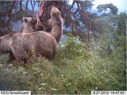 Le service de l’environnement du Conseil Général du Val d’Aran a relevé, le 3 septembre 2013, une série de photos automatiques, montrant une ourse suitée d’au moins 2 jeunes de l’année. Ces clichés ont été pris le 27 août 2013 à 19h47 dans le Val d’Aran.