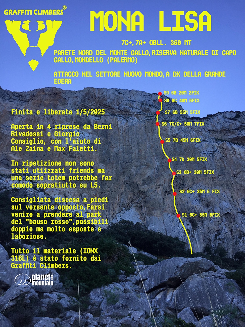 Berni Rivadossi et Giorgio Consiglio, aidés par Ale Zaina et Max Faletti, ont créé «Mona Lisa», une nouvelle montée sportive multiplit sur Monte Gallo à la périphérie de Palerme en Sicile.
