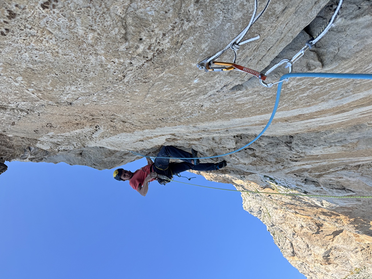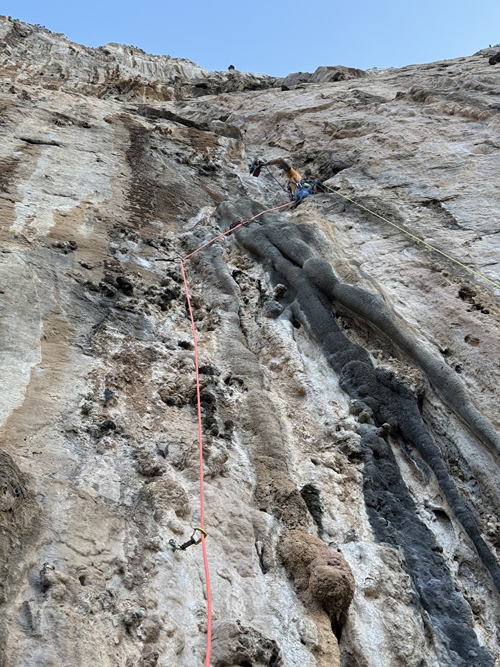 Comme toujours, l’escalade est spectaculaire: une succession rapide de poches, de fissures, de trésors et de coins sur des roches blanches et rouge peu impeccables du fond jusqu’au sommet. Les seules exceptions étant les premier et les derniers emplacements qui, étant légèrement glissants, avaient besoin de nettoyage de la végétation.
