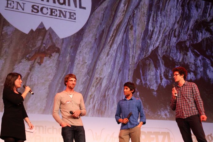Le point d’orgue de cette soirée fut sans contest le film d’Evrard Wendenbaum sur l’expé « Chinajam » (1h 15) en compagnie des belges Hanssens, Villanueva et Favresse. Tourné avec humour, on sent que l’équipe dégage une certaine expérience et maturité, rodée aux expéditions et aux big walls. Cela parait presque facile à les voir évoluer ! Le réalisateur français Evrard Wendenbaum fait figure d’intrus dans cette bande de gais lurons puisqu’il les accompagne pour la première fois. On suit l’équipe au gré des conditions météo difficiles avec le choix de la face, puis tous les détails de l’ascension jusqu’au sommet de Kyzyl Asker (5800 mètres) qui n’aura pas été qu’une partie de plaisir. 1200 mètres de big wall avec des conditions enneigées à braver le froid, attendre les conditions propices à la grimpe en musique dans les portaledges, 3 campements dans la face,…. Stéphane Hanssens finira l’expé avec des gelures au pied qui auraient pu lui valoir à quelques détails près l’amputation. Mais le granite sculpté superbe de la face semblait en valoir la peine, avec des longueurs exceptionnelles et des difficultés pouvant avoisiner le 7c/8a, pour un big wall de caractère dans une zone reculée et des images vraiment dépaysantes qui n’ont pas été faciles à capturer. La soirée se finira avec un film bonus des belges sur le Groenland. La bande a amené leur capitaine de bateau, Bob Shepton, 79 ans, faire une course avec eux. Un hommage rendu à ce bonhomme sans qui leur précédente aventure « Vertical sailing » aurait été impossible, pour un moment de partage et de complicité hors normes.