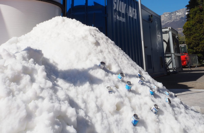Le ton est donné. En passant la porte d’entrée du salon ‘Mountain planet’ qui s’est déroulé du 18 au 20 Avril dernier, un des plus grands rassemblements planétaires des professionnels de l’aménagement de la montagne, on est accueilli par une énorme machine qui produit de la neige artificielle.